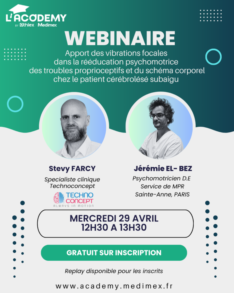 Au cours de ce webinaire, Stevy Farcy, démonstrateur chez Technoconcept, vous proposera une présentation complète du dispositif, de ses principales fonctionnalités et de ses possibilités d’utilisation. Cette introduction technique sera enrichie par l’intervention de Jérémie El-Bez, psychomotricien en service de MPR à l’Hôpital Sainte-Anne à Paris, qui partagera son retour d’expérience de terrain. À travers des situations concrètes issues de sa pratique clinique, il mettra en lumière l’intérêt du Vibramoov pour les psychomotriciens, en illustrant comment cet outil peut être intégré au quotidien, mais aussi détourné de manière créative pour développer des applications originales au service des patients.